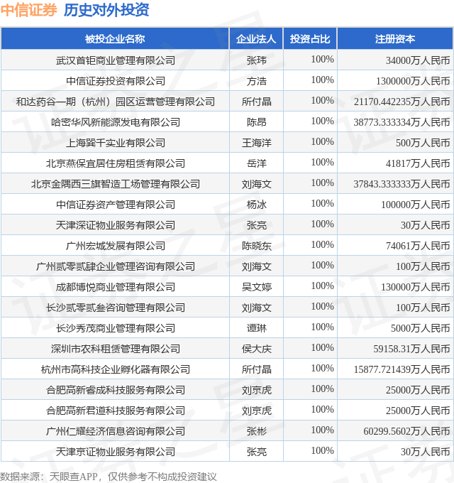 证券之星消息,根据天眼查APP显示,中信证券(600030.SH)新增一起对外投资事件,被投资公司为南京泉峰汽车精密技术股份有限公司,法定代表人潘龙泉,投资占比为0.32%。该公司从事汽车制造业,注册资本为27235.5339万人民币。目前,中信证券共存在对外投资309项,投资占比前20的项目见下表:
