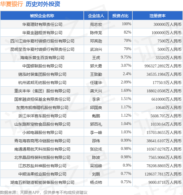 证券之星消息,根据天眼查APP显示,华夏银行(600015.SH)新增一起对外投资事件,被投资公司为小熊电器股份有限公司,法定代表人李一峰,投资占比为1.03%。该公司从事电气机械和器材制造业,注册资本为15703.8655万人民币。目前,华夏银行共存在对外投资69项,投资占比前20的项目见下表: