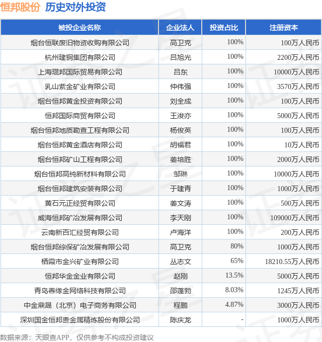证券之星消息,根据天眼查APP显示,恒邦股份(002237.SZ)新增一起对外投资事件,被投资公司为烟台恒邦综保矿冶发展有限公司,法定代表人高卫克,投资占比为80%。该公司从事有色金属矿采选业,注册资本为1000万人民币。目前,恒邦股份共存在对外投资20项,详见下表: