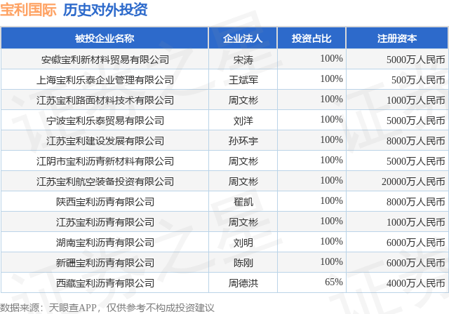 证券之星消息,根据天眼查APP显示,宝利国际(300135.SZ)新增一起对外投资事件,被投资公司为安徽宝利新材料贸易有限公司,法定代表人宋涛,投资占比为100%。该公司从事航空运输业,注册资本为5000万人民币。目前,宝利国际共存在对外投资12项,详见下表: