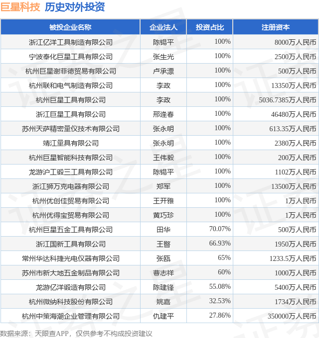 证券之星消息,根据天眼查APP显示,巨星科技(002444.SZ)新增一起对外投资事件,被投资公司为浙江亿洋工具制造有限公司,法定代表人陈锡平,投资占比为100%。该公司从事通用设备制造业,注册资本为8000万人民币。目前,巨星科技共存在对外投资25项,投资占比前20的项目见下表: