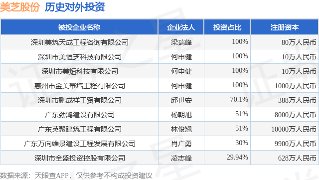 证券之星消息,根据天眼查APP显示,美芝股份(002856.SZ)新增一起对外投资事件,被投资公司为深圳美筑天成工程咨询有限公司,法定代表人梁瑞峰,投资占比为100%。该公司从事专业技术服务业,注册资本为80万人民币。目前,美芝股份共存在对外投资9项,详见下表: