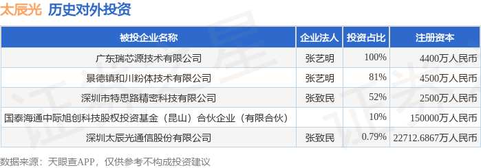 证券之星消息,根据天眼查APP显示,太辰光(300570.SZ)新增一起对外投资事件,被投资公司为国泰海通中际旭创科技股权投资基金(昆山)合伙企业(有限合伙),法定代表人,投资占比为10%。该公司从事资本市场服务,注册资本为150000万人民币。目前,太辰光共存在对外投资5项,详见下表: