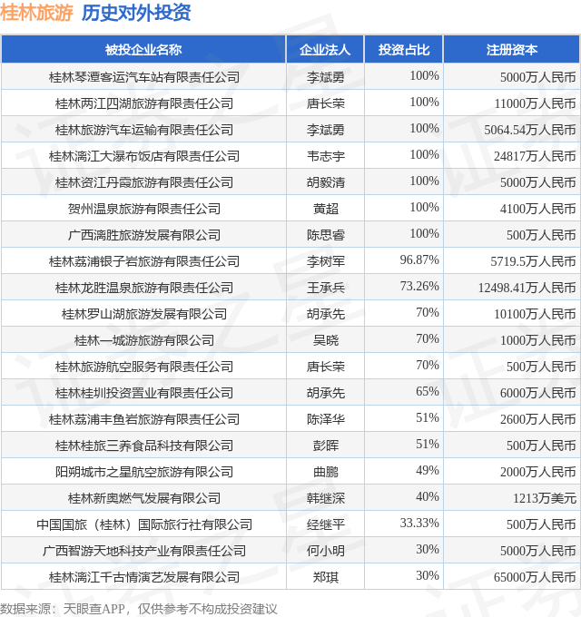 证券之星消息,根据天眼查APP显示,桂林旅游(000978.SZ)新增一起对外投资事件,被投资公司为桂林桂旅三养食品科技有限公司,法定代表人彭晖,投资占比为51%。该公司从事科技推广和应用服务业,注册资本为500万人民币。目前,桂林旅游共存在对外投资27项,投资占比前20的项目见下表: