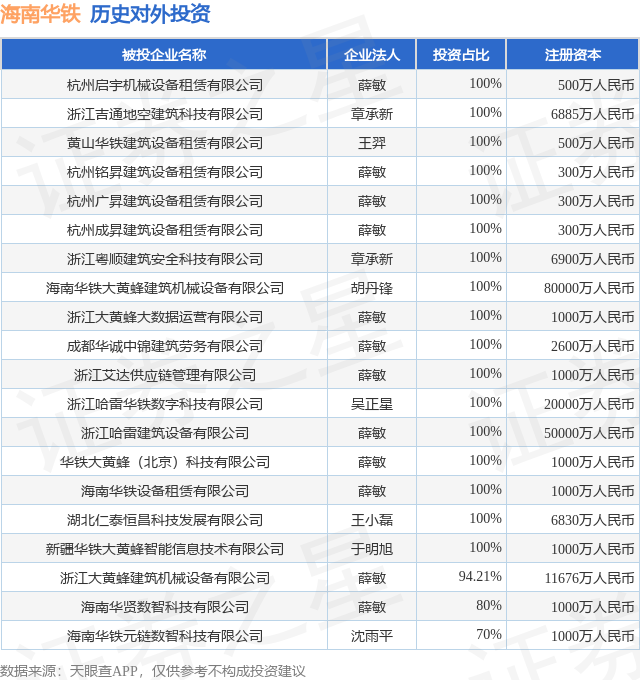证券之星消息,根据天眼查APP显示,海南华铁(603300.SH)新增一起对外投资事件,被投资公司为海南华铁联航科技有限公司,法定代表人王仪伟,投资占比为-。该公司从事铁路、船舶、航空航天和其他运输设备制造业,注册资本为1000万人民币。目前,海南华铁共存在对外投资45项,投资占比前20的项目见下表: