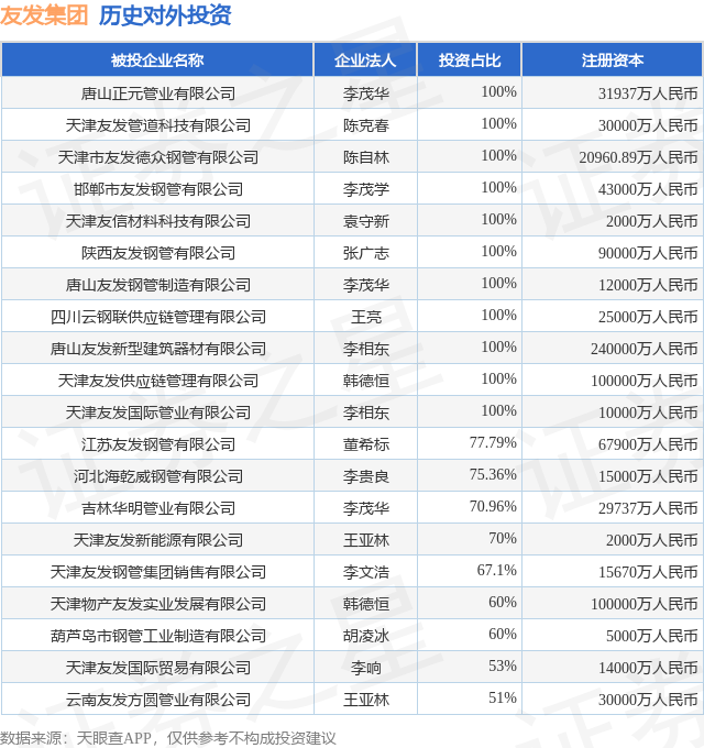 证券之星消息,根据天眼查APP显示,友发集团(601686.SH)新增一起对外投资事件,被投资公司为天津友发国际贸易有限公司,法定代表人李响,投资占比为53%。该公司从事批发业,注册资本为14000万人民币。目前,友发集团共存在对外投资24项,投资占比前20的项目见下表: