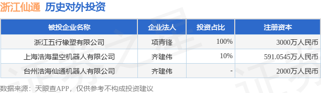 证券之星消息,根据天眼查APP显示,浙江仙通(603239.SH)新增一起对外投资事件,被投资公司为台州浩海仙通机器人有限公司,法定代表人齐建伟,投资占比为-。该公司从事计算机、通信和其他电子设备制造业,注册资本为2000万人民币。目前,浙江仙通共存在对外投资3项,详见下表: