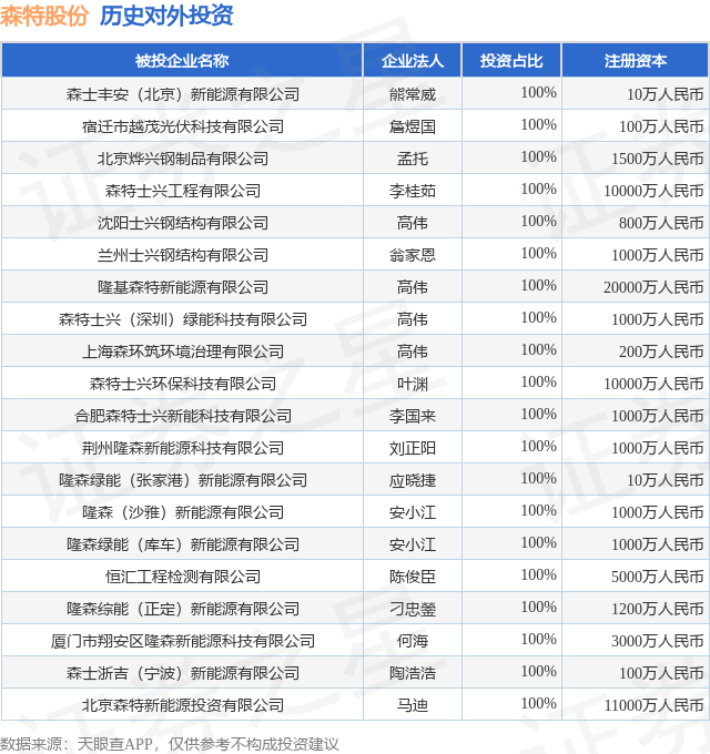 证券之星消息,根据天眼查APP显示,森特股份(603098.SH)新增一起对外投资事件,被投资公司为森士丰安(北京)新能源有限公司,法定代表人熊常威,投资占比为100%。该公司从事电力、热力生产和供应业,注册资本为10万人民币。目前,森特股份共存在对外投资40项,投资占比前20的项目见下表: