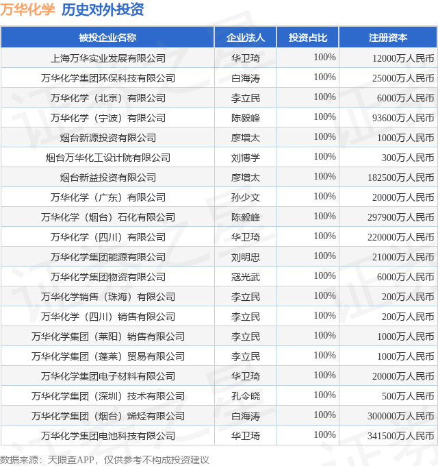 证券之星消息,根据天眼查APP显示,万华化学(600309.SH)新增一起对外投资事件,被投资公司为万华绿能(东明)清洁能源有限公司,法定代表人孙伟,投资占比为50%。该公司从事电力、热力生产和供应业,注册资本为72000万人民币。目前,万华化学共存在对外投资69项,投资占比前20的项目见下表: