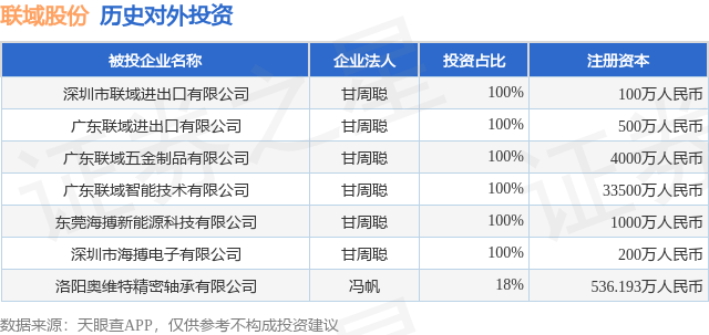 证券之星消息,根据天眼查APP显示,联域股份(001326.SZ)新增一起对外投资事件,被投资公司为洛阳奥维特精密轴承有限公司,法定代表人冯帆,投资占比为18%。该公司从事有色金属冶炼和压延加工业,注册资本为536.193万人民币。目前,联域股份共存在对外投资7项,详见下表: