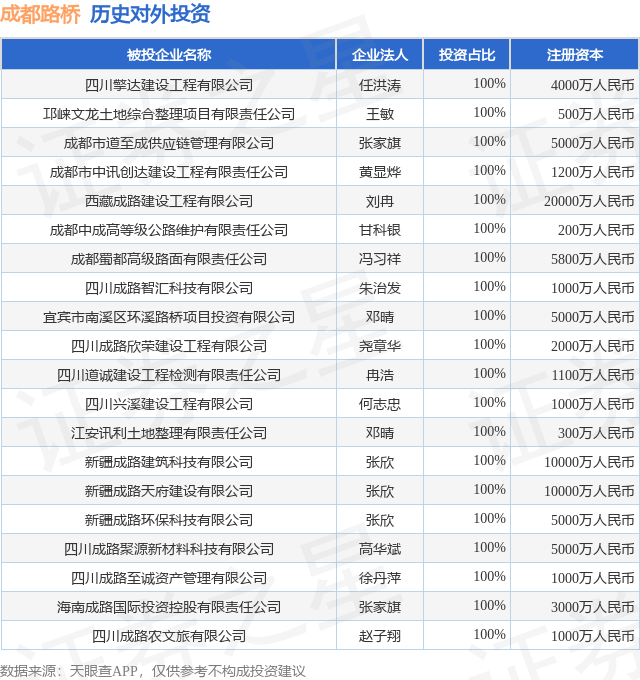 证券之星消息,根据天眼查APP显示,成都路桥(002628.SZ)新增一起对外投资事件,被投资公司为四川擎达建设工程有限公司,法定代表人任洪涛,投资占比为100%。该公司从事房屋建筑业,注册资本为4000万人民币。目前,成都路桥共存在对外投资29项,投资占比前20的项目见下表: