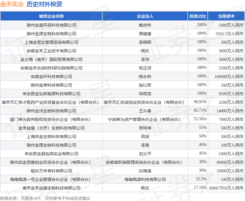 证券之星消息,根据天眼查APP显示,金禾实业(002597.SZ)新增一起对外投资事件,被投资公司为上海希望田野生态科技有限公司,法定代表人段翔宇,投资占比为9.09%。该公司从事科技推广和应用服务业,注册资本为113.4021万人民币。目前,金禾实业共存在对外投资36项,投资占比前20的项目见下表: