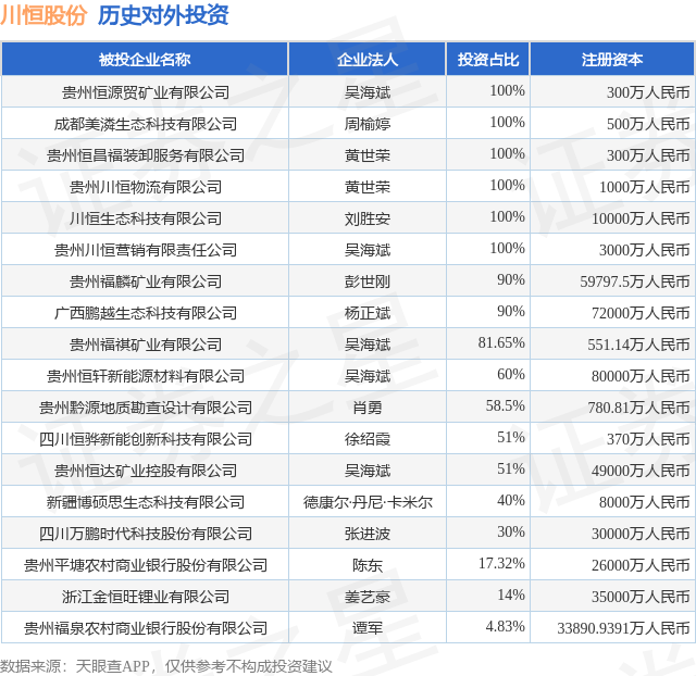 证券之星消息,根据天眼查APP显示,川恒股份(002895.SZ)新增一起对外投资事件,被投资公司为贵州恒源贸矿业有限公司,法定代表人吴海斌,投资占比为100%。该公司从事黑色金属矿采选业,注册资本为300万人民币。目前,川恒股份共存在对外投资18项,详见下表: