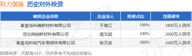 证券之星消息,根据天眼查APP显示,科力装备(301552.SZ)新增一起对外投资事件,被投资公司为秦皇岛科瀚新材料有限公司,法定代表人于德江,投资占比为100%。该公司从事化学原料和化学制品制造业,注册资本为1800万人民币。目前,科力装备共存在对外投资3项,详见下表: