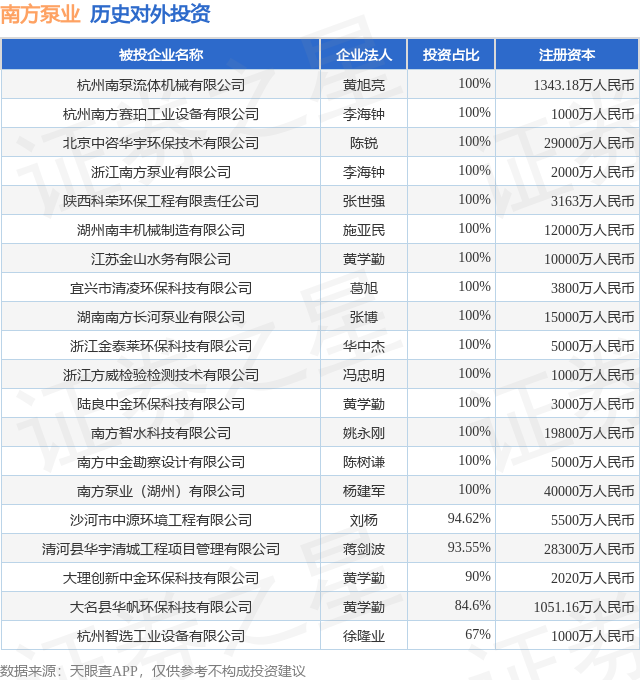 证券之星消息,根据天眼查APP显示,南方泵业(300145.SZ)新增一起对外投资事件,被投资公司为杭州南泵流体机械有限公司,法定代表人黄旭亮,投资占比为100%。该公司从事通用设备制造业,注册资本为1343.18万人民币。目前,南方泵业共存在对外投资26项,投资占比前20的项目见下表: