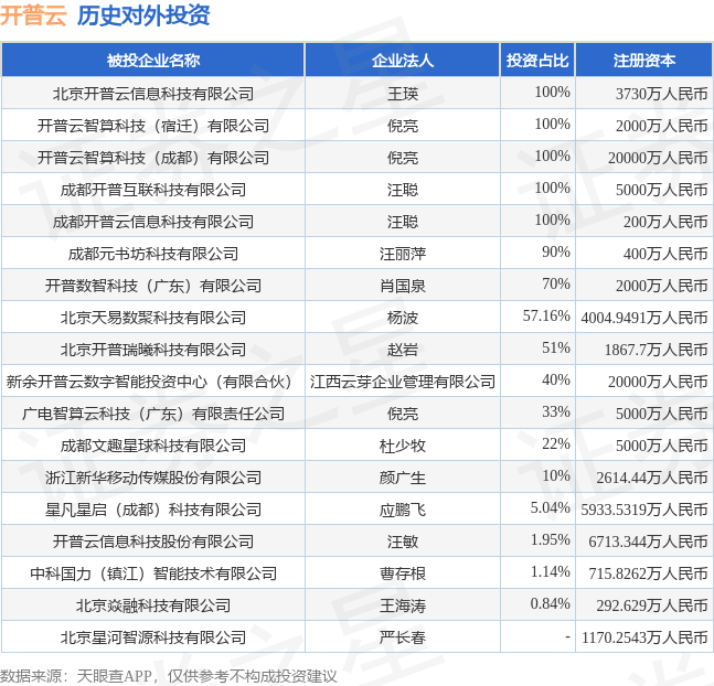 证券之星消息,根据天眼查APP显示,开普云(688228.SH)新增一起对外投资事件,被投资公司为广电智算云科技(广东)有限责任公司,法定代表人倪亮,投资占比为33%。该公司从事互联网和相关服务,注册资本为5000万人民币。目前,开普云共存在对外投资18项,详见下表: