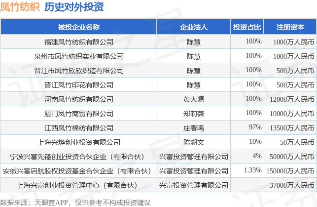 证券之星消息,根据天眼查APP显示,凤竹纺织(600493.SH)新增一起对外投资事件,被投资公司为安徽兴富启航股权投资基金合伙企业(有限合伙),法定代表人兴富投资管理有限公司,投资占比为1.33%。该公司从事资本市场服务,注册资本为150000万人民币。目前,凤竹纺织共存在对外投资11项,详见下表: