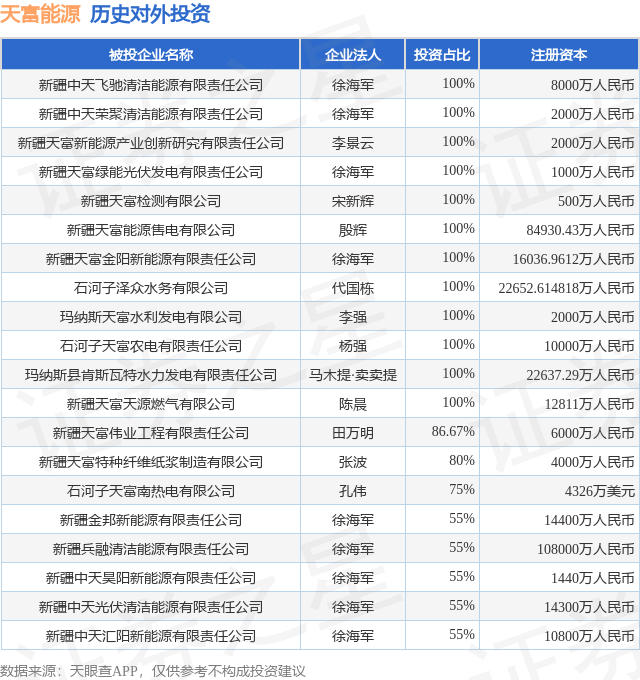 证券之星消息,根据天眼查APP显示,天富能源(600509.SH)新增一起对外投资事件,被投资公司为新疆天富融汇低碳能源合伙企业(有限合伙),法定代表人新疆中天飞驰清洁能源有限责任公司,投资占比为-。该公司从事电力、热力生产和供应业,注册资本为259850万人民币。目前,天富能源共存在对外投资27项,投资占比前20的项目见下表: