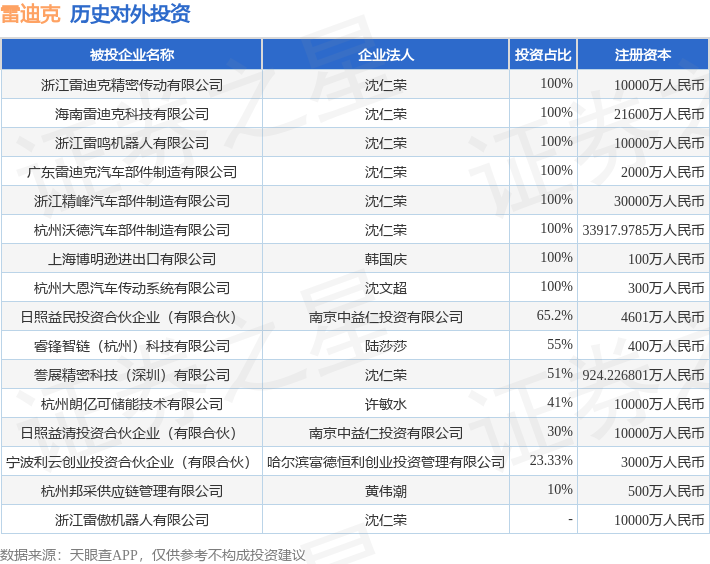 证券之星消息,根据天眼查APP显示,雷迪克(300652.SZ)新增一起对外投资事件,被投资公司为浙江雷傲机器人有限公司,法定代表人沈仁荣,投资占比为-。该公司从事计算机、通信和其他电子设备制造业,注册资本为10000万人民币。目前,雷迪克共存在对外投资16项,详见下表:
