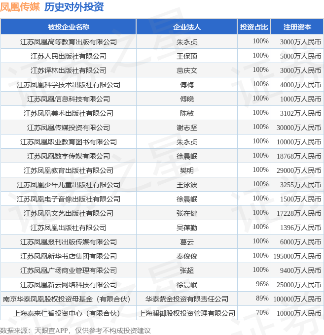 通过天眼查大数据分析,江苏凤凰出版传媒股份有限公司共对外投资了103家企业,参与招投标项目1119次;财产线索方面有商标信息22条,著作权信息5条;此外企业还拥有行政许可29个。据2024年报数据,凤凰传媒商誉5558.2万元,同比减24.51%。长期股权投资13.45亿元,同比增5.3%。