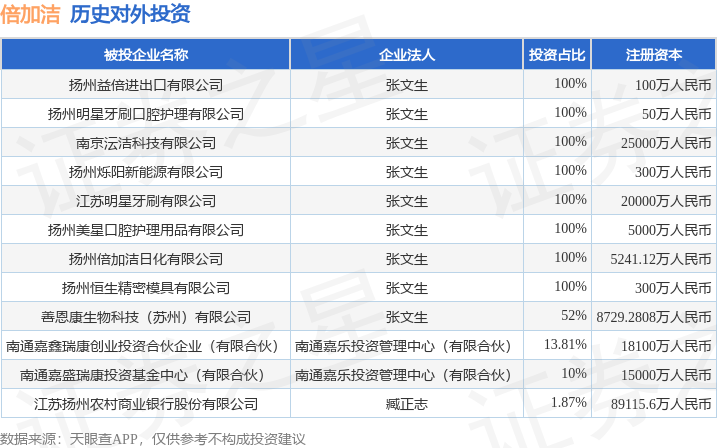 证券之星消息,根据天眼查APP显示,倍加洁(603059.SH)新增一起对外投资事件,被投资公司为扬州益倍进出口有限公司,法定代表人张文生,投资占比为100%。该公司从事批发业,注册资本为100万人民币。目前,倍加洁共存在对外投资12项,详见下表: