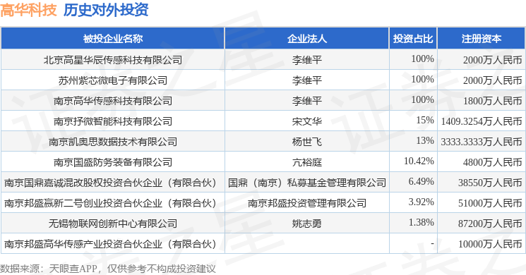 证券之星消息,根据天眼查APP显示,高华科技(688539.SH)新增一起对外投资事件,被投资公司为南京邦盛高华传感产业投资合伙企业(有限合伙),法定代表人,投资占比为-。该公司从事资本市场服务,注册资本为10000万人民币。目前,高华科技共存在对外投资10项,详见下表: