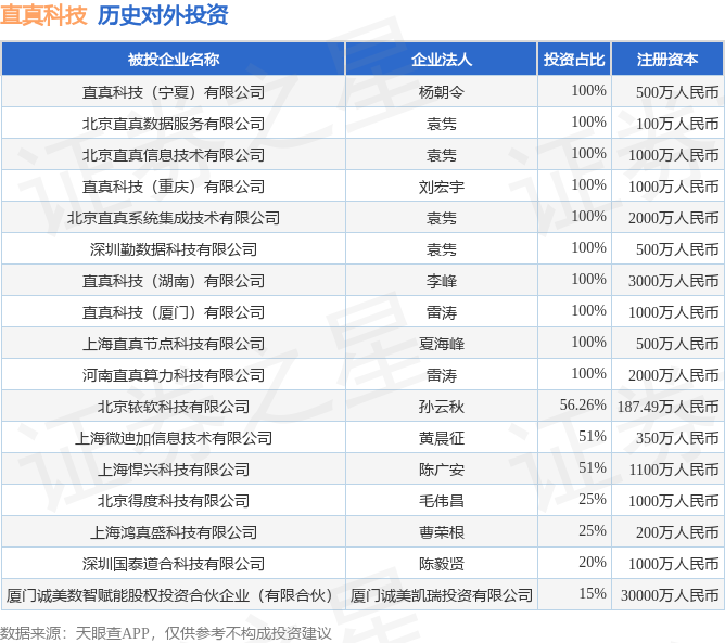 证券之星消息,根据天眼查APP显示,直真科技(003007.SZ)新增一起对外投资事件,被投资公司为直真科技(宁夏)有限公司,法定代表人杨朝令,投资占比为100%。该公司从事计算机、通信和其他电子设备制造业,注册资本为500万人民币。目前,直真科技共存在对外投资17项,详见下表: