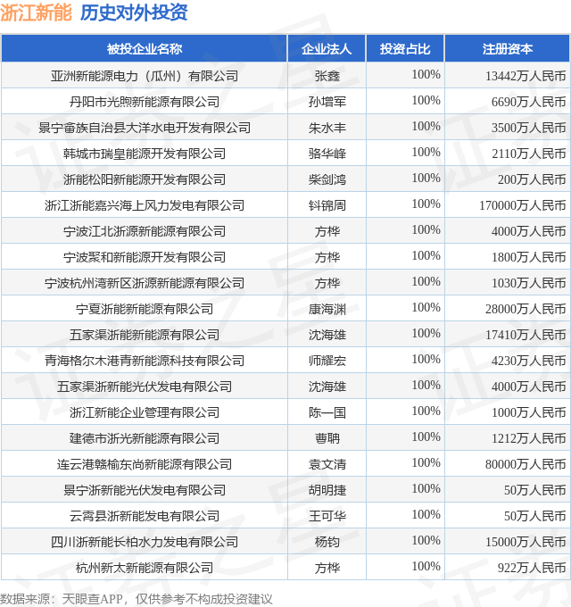 证券之星消息,根据天眼查APP显示,浙江新能(600032.SH)新增一起对外投资事件,被投资公司为文成县浙新绿能光伏发电有限公司,法定代表人许雷,投资占比为26%。该公司从事电力、热力生产和供应业,注册资本为50万人民币。目前,浙江新能共存在对外投资89项,投资占比前20的项目见下表: