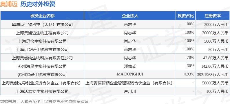 证券之星消息,根据天眼查APP显示,奥浦迈(688293.SH)新增一起对外投资事件,被投资公司为上海奥创先导创业投资合伙企业(有限合伙),法定代表人上海腾信智药企业管理咨询合伙企业(有限合伙),投资占比为-。该公司从事资本市场服务,注册资本为50000万人民币。目前,奥浦迈共存在对外投资9项,详见下表: