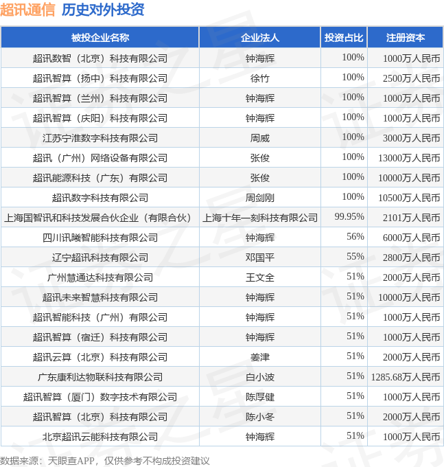 证券之星消息,根据天眼查APP显示,超讯通信(603322.SH)新增一起对外投资事件,被投资公司为超讯云算(北京)科技有限公司,法定代表人姜津,投资占比为51%。该公司从事软件和信息技术服务业,注册资本为2000万人民币。目前,超讯通信共存在对外投资29项,投资占比前20的项目见下表: