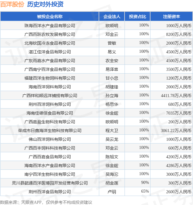 证券之星消息,根据天眼查APP显示,百洋股份(002696.SZ)新增一起对外投资事件,被投资公司为珠海百洋水产食品有限公司,法定代表人欧顺明,投资占比为100%。该公司从事农副食品加工业,注册资本为1000万人民币。目前,百洋股份共存在对外投资27项,投资占比前20的项目见下表: