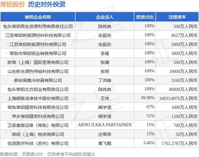 证券之星消息,根据天眼查APP显示,常铝股份(002160.SZ)新增一起对外投资事件,被投资公司为萍乡常铝精密科技有限公司,法定代表人臧宇澄,投资占比为51%。该公司从事汽车制造业,注册资本为1200万人民币。目前,常铝股份共存在对外投资14项,详见下表: