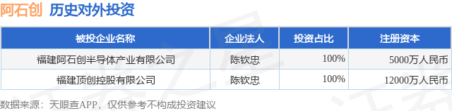 证券之星消息,根据天眼查APP显示,阿石创(300706.SZ)新增一起对外投资事件,被投资公司为福建阿石创半导体产业有限公司,法定代表人陈钦忠,投资占比为100%。该公司从事计算机、通信和其他电子设备制造业,注册资本为5000万人民币。目前,阿石创共存在对外投资2项,详见下表:
