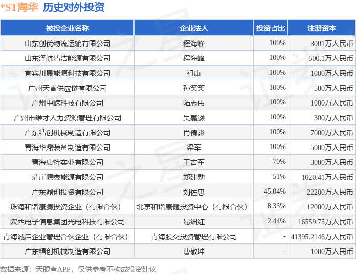 证券之星消息,根据天眼查APP显示,*ST海华(600243.SH)新增一起对外投资事件,被投资公司为山东创优物流运输有限公司,法定代表人程海峰,投资占比为100%。该公司从事道路运输业,注册资本为3001万人民币。目前,*ST海华共存在对外投资15项,详见下表:
