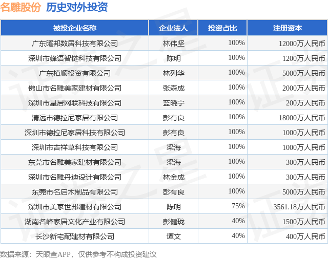 证券之星消息,根据天眼查APP显示,名雕股份(002830.SZ)新增一起对外投资事件,被投资公司为广东曜邦数居科技有限公司,法定代表人林伟坚,投资占比为100%。该公司从事软件和信息技术服务业,注册资本为12000万人民币。目前,名雕股份共存在对外投资14项,详见下表: