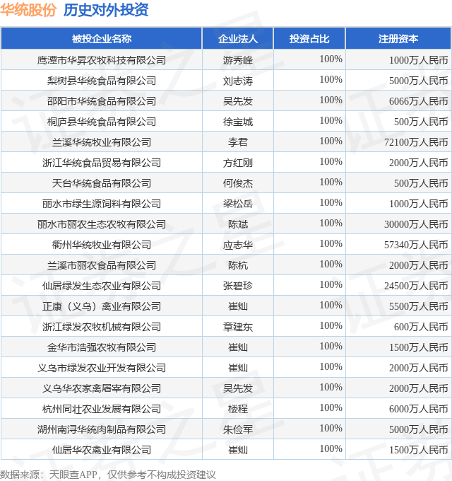 通过天眼查大数据分析,浙江华统肉制品股份有限公司共对外投资了76家企业,参与招投标项目111次;财产线索方面有商标信息52条,专利信息15条,著作权信息1条;此外企业还拥有行政许可5232个。据2024年报数据,华统股份商誉6516.28万元,同比未变化。长期股权投资5288.83万元,同比增22.45%。