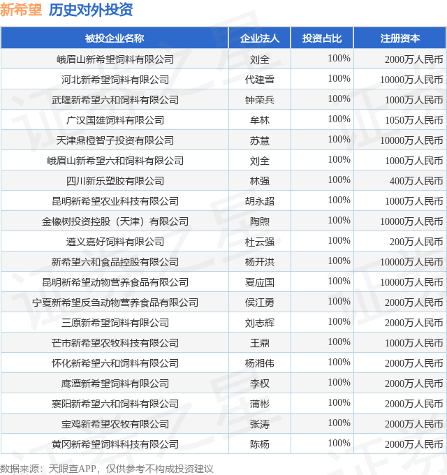证券之星消息,根据天眼查APP显示,新希望(000876.SZ)新增一起对外投资事件,被投资公司为峨眉山新希望饲料有限公司,法定代表人刘全,投资占比为100%。该公司从事农副食品加工业,注册资本为2000万人民币。目前,新希望共存在对外投资54项,投资占比前20的项目见下表: