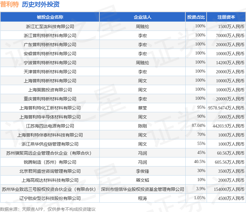 证券之星消息,根据天眼查APP显示,普利特(002324.SZ)新增一起对外投资事件,被投资公司为浙江汇至泷科技有限公司,法定代表人周臻纶,投资占比为100%。该公司从事科技推广和应用服务业,注册资本为1500万人民币。目前,普利特共存在对外投资21项,投资占比前20的项目见下表: