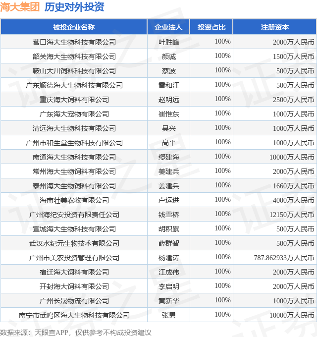 证券之星消息,根据天眼查APP显示,海大集团(002311.SZ)新增一起对外投资事件,被投资公司为营口海大生物科技有限公司,法定代表人叶胜峰,投资占比为100%。该公司从事农副食品加工业,注册资本为2000万人民币。目前,海大集团共存在对外投资212项,投资占比前20的项目见下表: