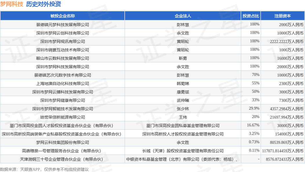 证券之星消息,根据天眼查APP显示,梦网科技(002123.SZ)新增一起对外投资事件,被投资公司为天津渤钢三十号企业管理合伙企业(有限合伙),法定代表人中银资本私募基金管理(北京)有限公司(委派代表:杨旭)、,投资占比为-。该公司从事资本市场服务,注册资本为8576.872433万人民币。目前,梦网科技共存在对外投资17项,详见下表:
