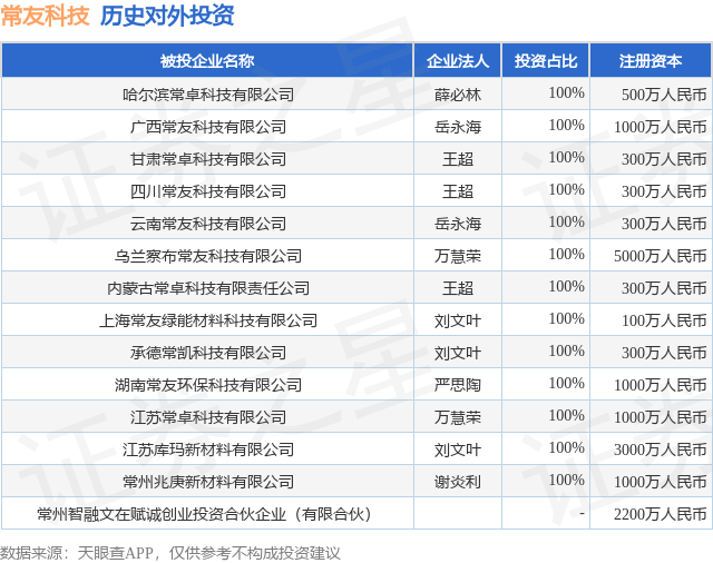 证券之星消息,根据天眼查APP显示,常友科技(301557.SZ)新增一起对外投资事件,被投资公司为常州智融文在赋诚创业投资合伙企业(有限合伙),法定代表人,投资占比为-。该公司从事资本市场服务,注册资本为2200万人民币。目前,常友科技共存在对外投资14项,详见下表: