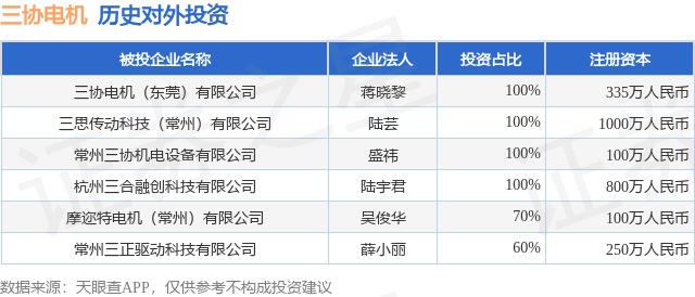 证券之星消息,根据天眼查APP显示,三协电机(920100.BJ)新增一起对外投资事件,被投资公司为三协电机(东莞)有限公司,法定代表人蒋晓黎,投资占比为100%。该公司从事电气机械和器材制造业,注册资本为335万人民币。目前,三协电机共存在对外投资6项,详见下表: