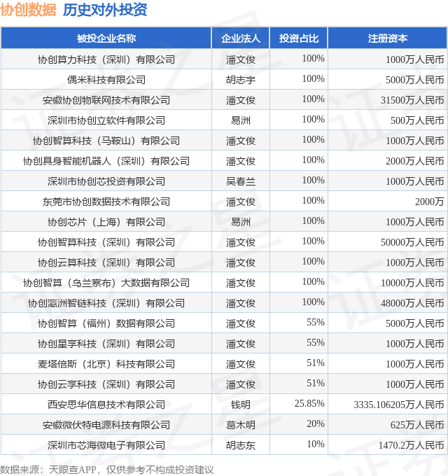 证券之星消息,根据天眼查APP显示,协创数据(300857.SZ)新增一起对外投资事件,被投资公司为协创算力科技(深圳)有限公司,法定代表人潘文俊,投资占比为100%。该公司从事互联网和相关服务,注册资本为1000万人民币。目前,协创数据共存在对外投资23项,投资占比前20的项目见下表: