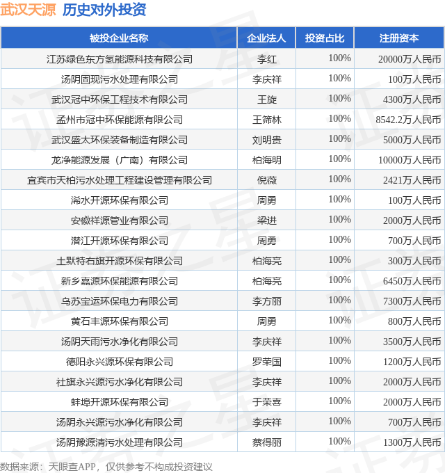 证券之星消息,根据天眼查APP显示,武汉天源(301127.SZ)新增一起对外投资事件,被投资公司为江苏绿色东方氢能源科技有限公司,法定代表人李红,投资占比为100%。该公司从事燃气生产和供应业,注册资本为20000万人民币。目前,武汉天源共存在对外投资60项,投资占比前20的项目见下表: