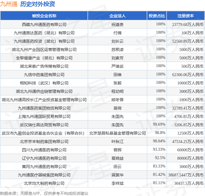 证券之星消息,根据天眼查APP显示,九州通(600998.SH)新增一起对外投资事件,被投资公司为湖北九州通瑞泽医药有限公司,法定代表人田云,投资占比为51%。该公司从事医药制造业,注册资本为3000万人民币。目前,九州通共存在对外投资76项,投资占比前20的项目见下表: