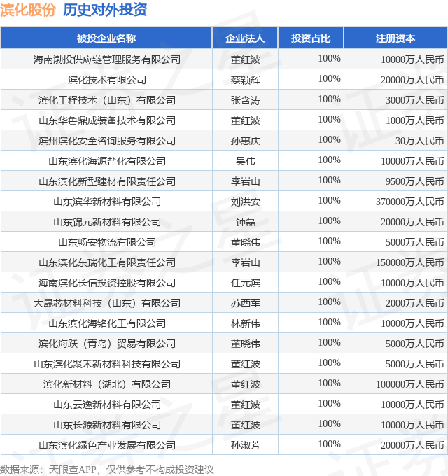 证券之星消息,根据天眼查APP显示,滨化股份(601678.SH)新增一起对外投资事件,被投资公司为海南渤投供应链管理服务有限公司,法定代表人董红波,投资占比为100%。该公司从事软件和信息技术服务业,注册资本为10000万人民币。目前,滨化股份共存在对外投资36项,投资占比前20的项目见下表: