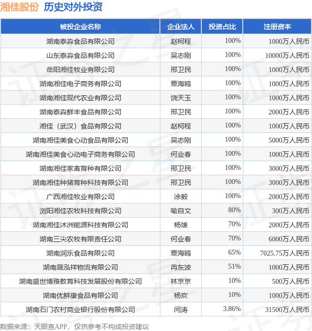 证券之星消息,根据天眼查APP显示,湘佳股份(002982.SZ)新增一起对外投资事件,被投资公司为湖南优鲜康食品有限公司,法定代表人杨欢,投资占比为10%。该公司从事食品制造业,注册资本为1000万人民币。目前,湘佳股份共存在对外投资21项,投资占比前20的项目见下表: