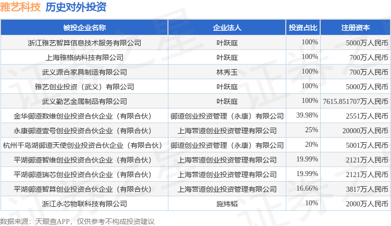 证券之星消息,根据天眼查APP显示,雅艺科技(301113.SZ)新增一起对外投资事件,被投资公司为浙江雅艺智算信息技术服务有限公司,法定代表人叶跃庭,投资占比为100%。该公司从事软件和信息技术服务业,注册资本为5000万人民币。目前,雅艺科技共存在对外投资12项,详见下表: