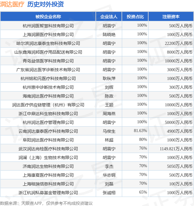 证券之星消息,根据天眼查APP显示,润达医疗(603108.SH)新增一起对外投资事件,被投资公司为北京享悦慧柏医学科技有限公司,法定代表人唐莹,投资占比为-。该公司从事科技推广和应用服务业,注册资本为166.6667万人民币。目前,润达医疗共存在对外投资64项,投资占比前20的项目见下表: