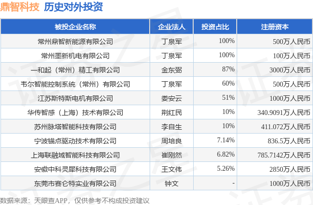 证券之星消息,根据天眼查APP显示,鼎智科技(920593.BJ)新增一起对外投资事件,被投资公司为东莞市赛仑特实业有限公司,法定代表人钟文,投资占比为-。该公司从事电气机械和器材制造业,注册资本为1000万人民币。目前,鼎智科技共存在对外投资11项,详见下表: